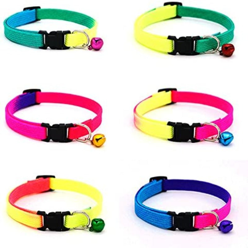 Outfit your cat in style with these 1 Set Rainbow Colorful Pet Collars. These personalized cat collars come with a quick release, making them safe and comfortable for your cat to wear. With a variety of colors and patterns to choose from, you can find the perfect collar for your cat's personality. The bell's decoration adds a touch of class to these collars, making them the perfect accessory for your dapper feline friend.