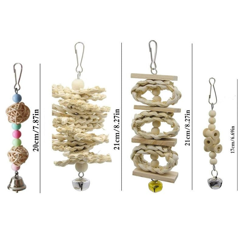 A multi-toy set provides variety across chewing, climbing, swinging, and sound play. Rotating or rearranging the toys regularly keeps your bird mentally stimulated and physically active, reducing boredom-related behaviors.
