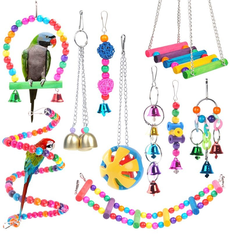 This bird swing toy set is available in four configurations: 5pcs, Bell 6pcs, 6pcs, and 10pcs. Larger sets offer more variety for decorating the cage and keeping your bird engaged longer.