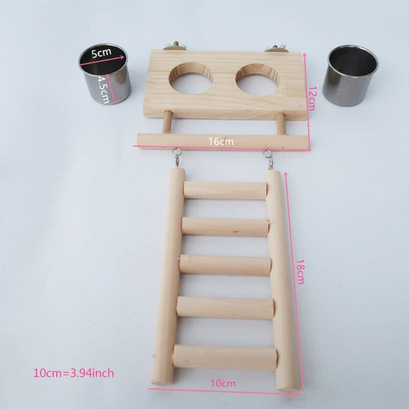 This Bird Wood Ladder Toy With Stainless Steel Feeding Bowl is made of safety and environmentally friendly materials. Easy to Install and Clean, The package is equipped with mounting screws and iron plates, with it you can easily fix the bird platform on the cage. The bird feeding bowls are detachable and can be cleaned with water.