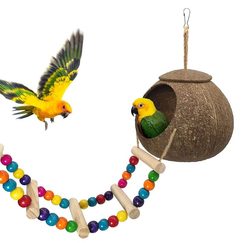 Bring some life into your home with the aid of this portable birdcage. This charming plastic Coconut Birds Nest Hut With Ladder is a great addition to any home. It provides a cozy sanctuary for your bird friends. You'll enjoy hearing the joyous tweeting of birds in your own yard as they make their home in this charming bird nest.