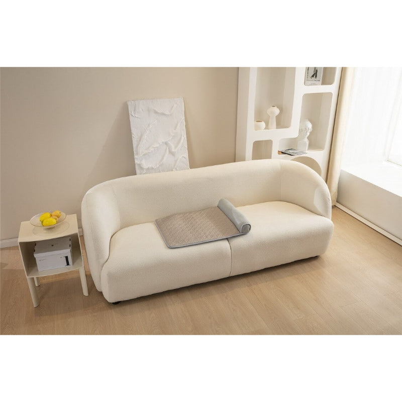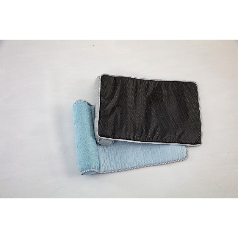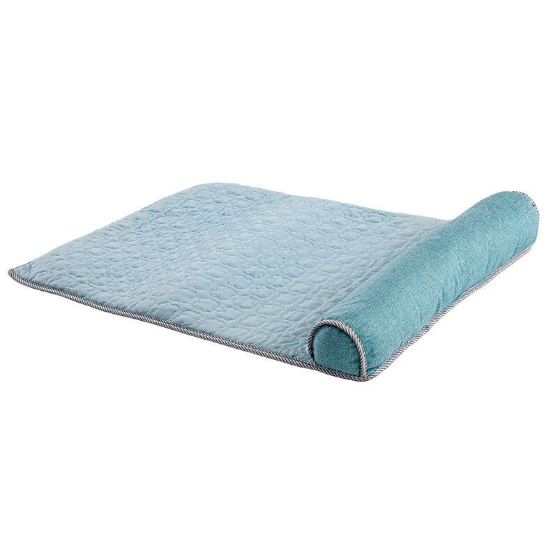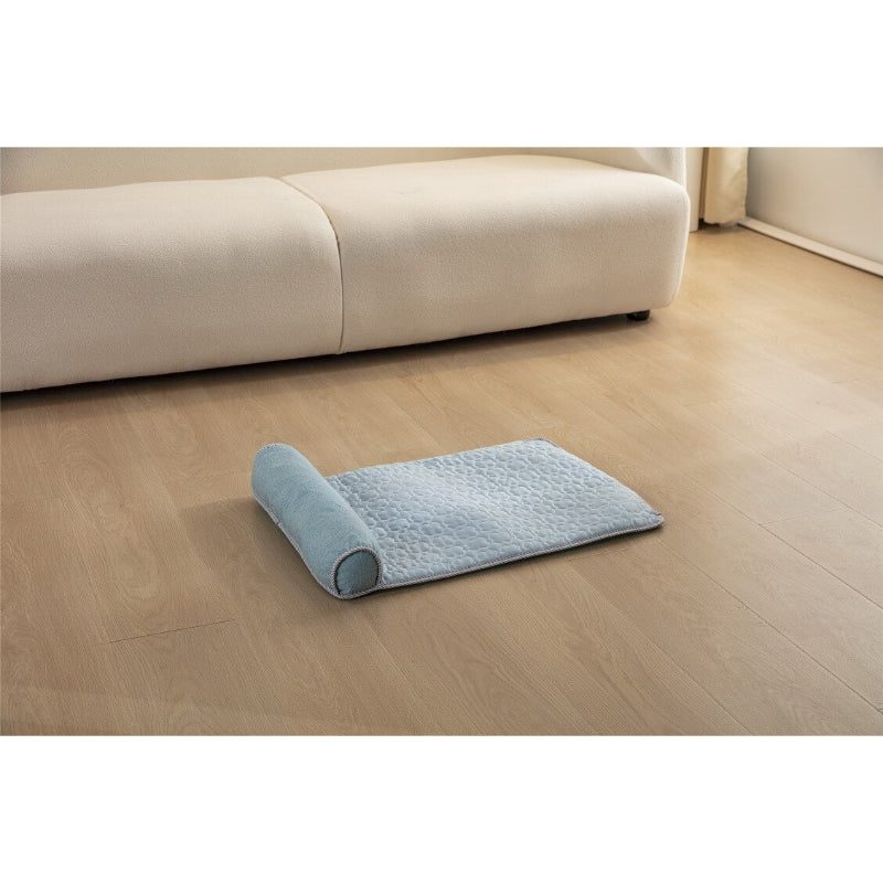 The three size options are: Small (60x40cm) best for cats and small dogs up to 5kg, Medium (70x50cm) for dogs 5–12kg, and Large (80x60cm) for dogs 12–20kg. These are flat sofa mat dimensions; there are no raised walls. If your dog prefers to hang limbs off the edge when sleeping, size up one.