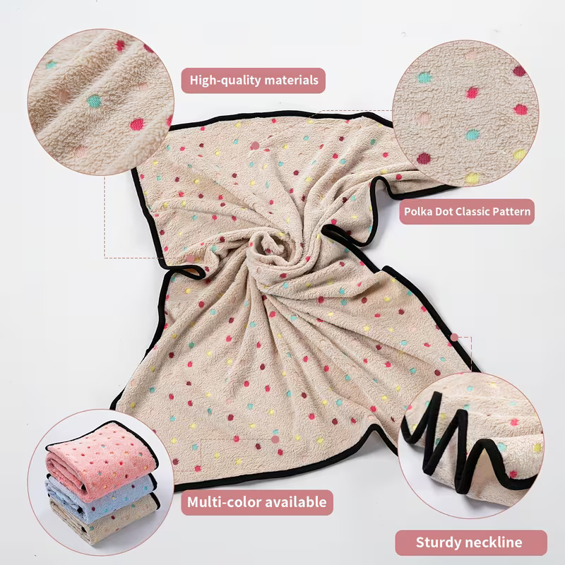 Made from polyester coral flannel, this pet blanket offers softness and comfort. It is available in various colors and patterns, including grey dots, light coffee, blue dots, little pink dots, and light brown dots, ensuring you can choose the one that suits your pet’s style. The blanket is designed to be used in multiple settings, whether it’s your pet’s bed, a couch, or during travel.