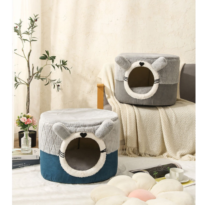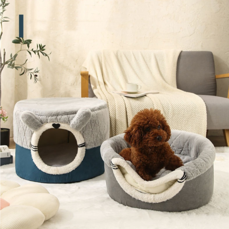 Soft Plush Pet Bed Enclosed Kennel is a reversible puppy kennel, it has a removable lid that can be used to cover the pet, and if not it can be moved to the bottom to give it a height. It is soft and furry which makes it comfortable for pets, it can be used in all seasons and the lid can be used while outdoor. It comes in two colors that are grey and blue and also in different sizes of 40 and 50 CM.